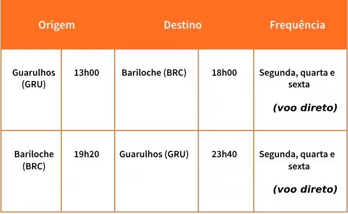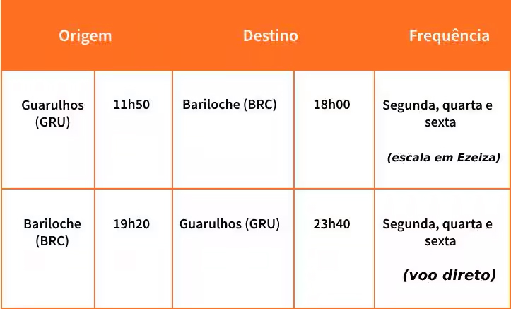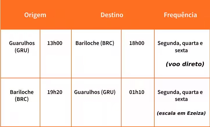 Entre os dias 2 e 7 de julho, as saídas de GRU para BRC são diretas, enquanto a volta de BRC para o Brasil tem uma escala no aeroporto de Ezeiza (EZE). De 9 de julho a 22 de agosto, as operações são sempre diretas, tanto a ida quanto a volta. Entre os dias 25 e 29 de agosto, as decolagens a partir de GRU fazem escala em Ezeiza, ao passo que a volta do destino de inverno acontece sem paradas (veja tabelas abaixo com frequências e horários).