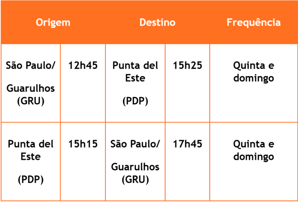 O voo G3 7223 partirá de Guarulhos às 12h45 e aterrissará no balneário uruguaio às 15h25, às quintas e domingos. Nos mesmos dias da semana, o G3 7224 decolará do Aeroporto Internacional de Punta del Este às 15h15, pousando na região metropolitana de São Paulo às 17h45.