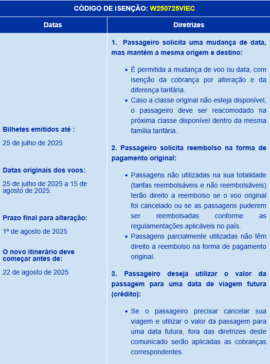 • É permitido 1 (uma) alteração por passageiro. Caso sejam realizadas alterações adicionais fora das condições estabelecidas neste comunicado, serão aplicadas as cobranças correspondentes.
