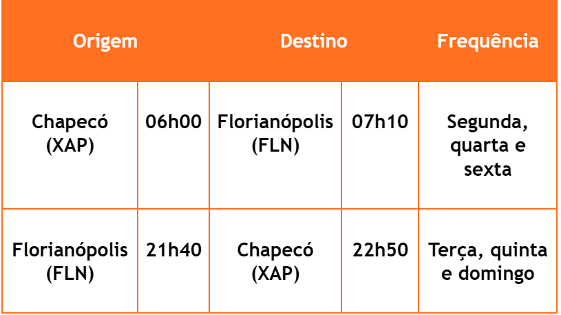 A ligação do oeste de Santa Catarina (Chapecó) com Florianópolis representa um significativo avanço para os catarinenses, que poderão acessar o litoral do Estado em apenas 1 hora de voo, favorecendo as viagens de negócios e lazer e ainda as conexões ali oferecidas pela GOL, inclusive para a Argentina. A partir de outubro, serão 3 frequências semanais sem escalas de ida e volta, às segundas, quartas e sextas no sentido XAP-FLN, e às terças, quintas e domingos no trecho FLN-XAP [veja tabela abaixo, com dias e horários]. Em Chapecó, a GOL já oferece voos diretos para os aeroportos de Guarulhos (GRU) e Congonhas, em São Paulo.