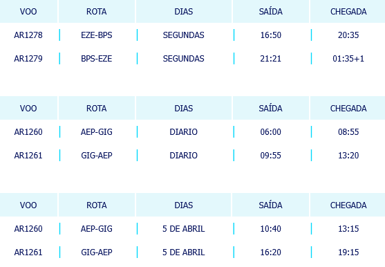 Informamos que Aerolíneas Argentinas para a temporada alta de verão adicionará mais frequências a Porto Seguro de 12 de janeiro26 a 16 de fevereiro26 e mais frequências a Rio de Janeiro de 4 de Janeiro26 a 29 de março26 e outra frequência para 05 de abril26.