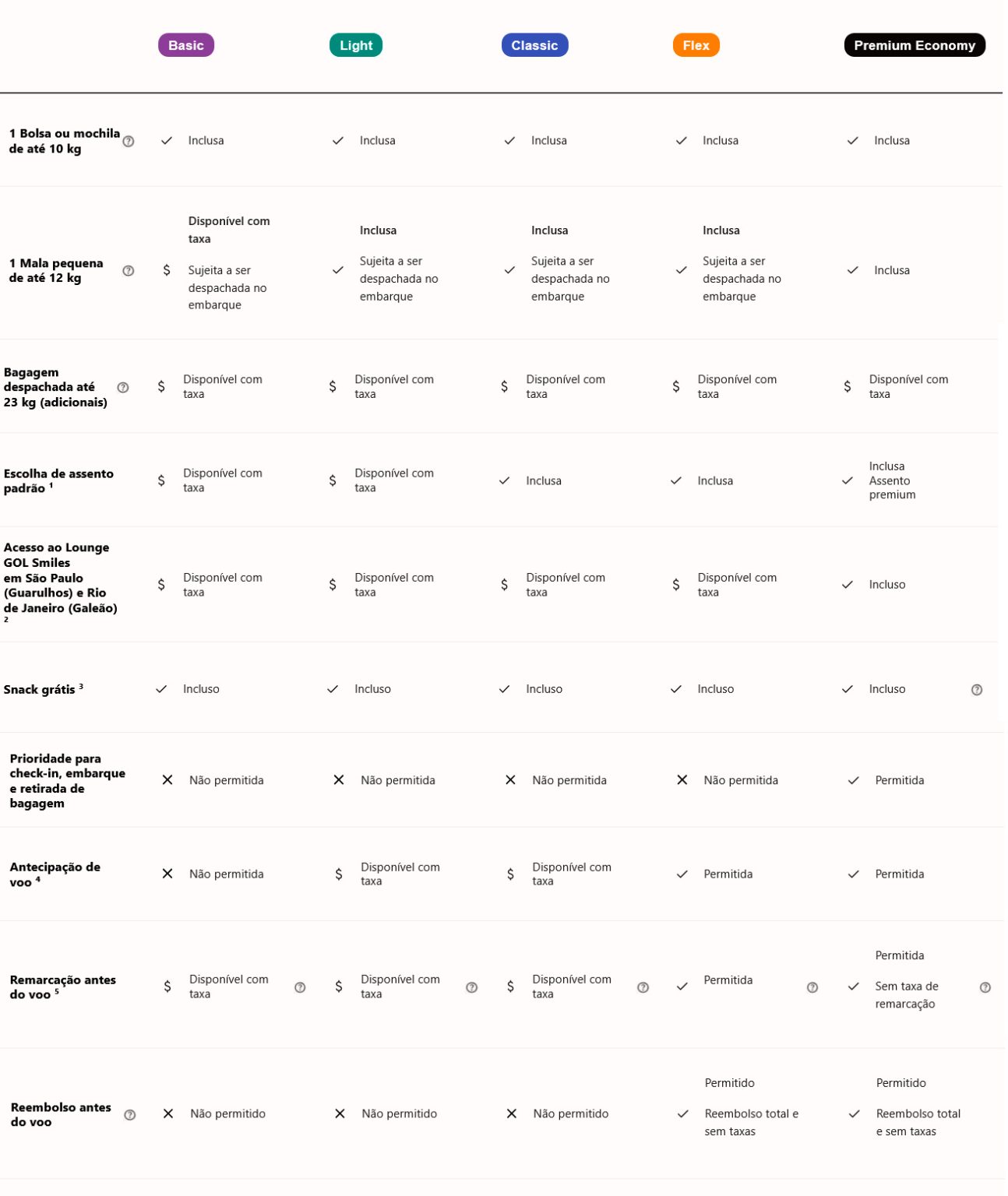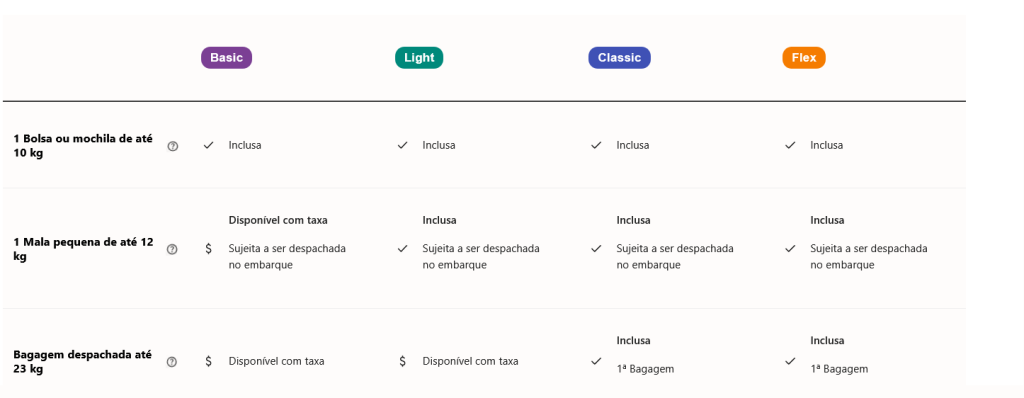 A tarifa Basic inclui uma Bolsa ou Mochila até 10 kg. As demais tarifas, também incluem uma Mala pequena de até 12 kg.