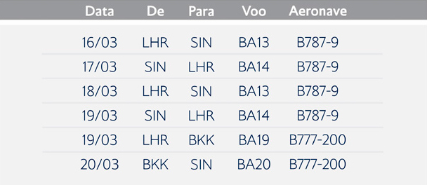 BA: Voos extras para Singapura e Bangkok 13 de março de 2026 SkyTeam News A British Airways anuncia voos extras para SIN e BKK, oferecendo opções adicionais para conectar seus passageiros com a Ásia. Confira as datas destas operações: Fonte: informativo British Airways