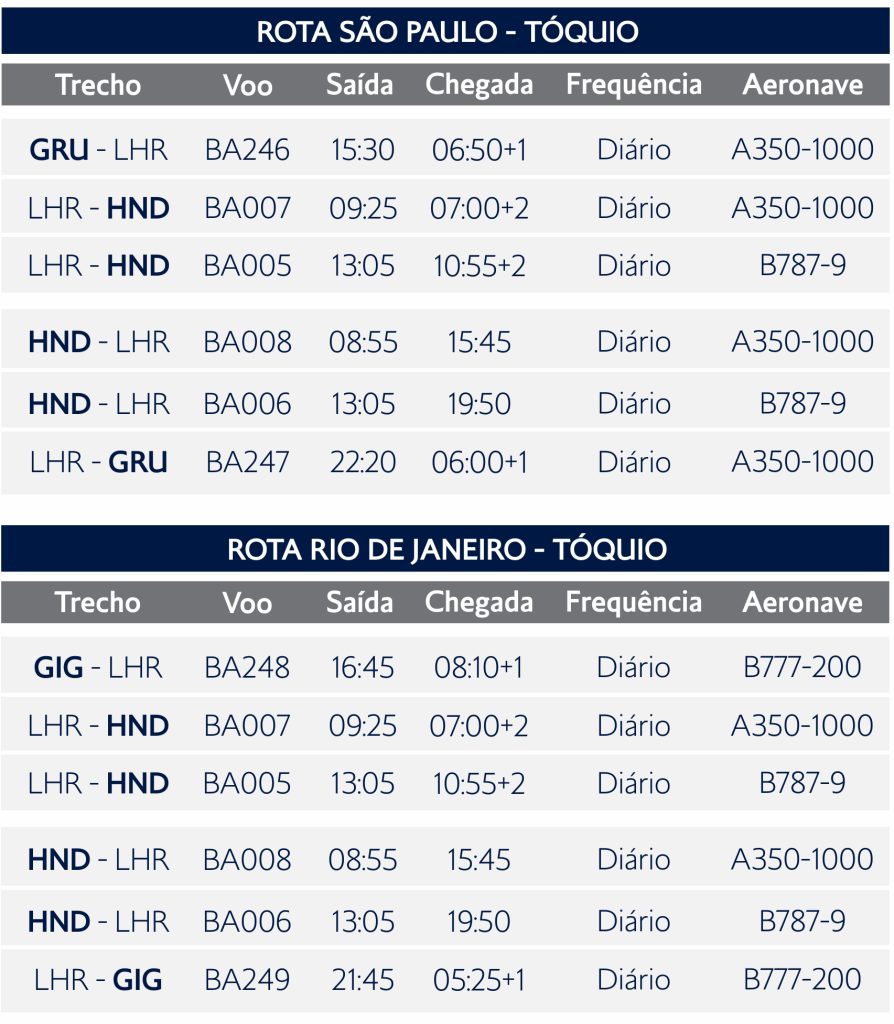 De 29 março de 2026 até o final da temporada de inverno europeu a British Airways incrementará suas operações para Tóquio Haneda oferecendo 2 frequências diárias saindo de Londres – Heathrow, com ótimo tempo de conexões dos nossos voos diários saindo de São Paulo e Rio de Janeiro.